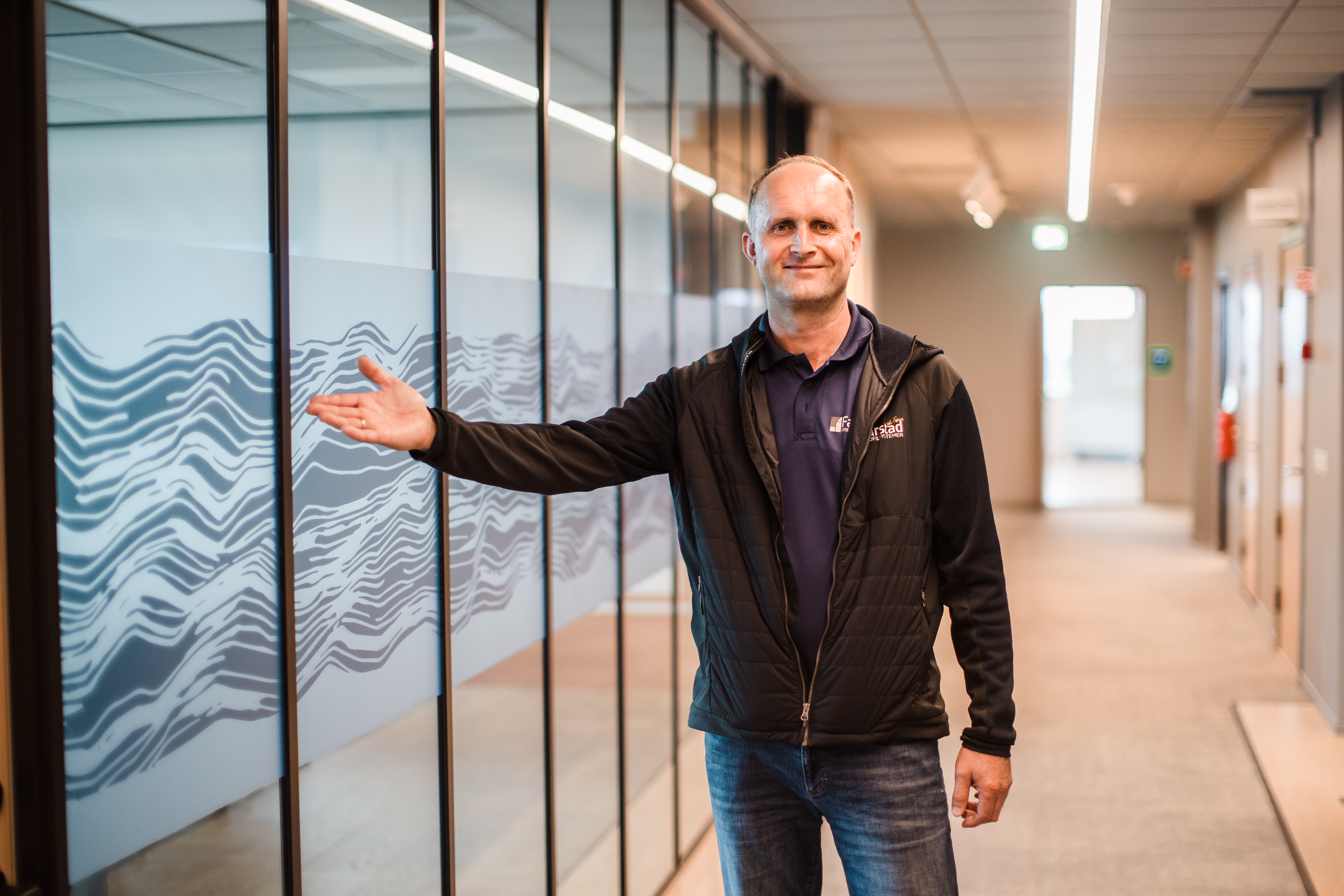 Det forteller Ted Bakke som er drifts- og byggansvarlig for det høyreiste kontorbygget i Badehusgata 37. Han og interiørarkitekt Monica Døhlie Heck måtte finne løsninger på hvordan de kunne åpne opp kontorene uten at hele etasjen skulle bli et stort fellesareal, og samtidig skape lyse, men lydtette rom. Løsningen ble Farstad Profilsystemer.