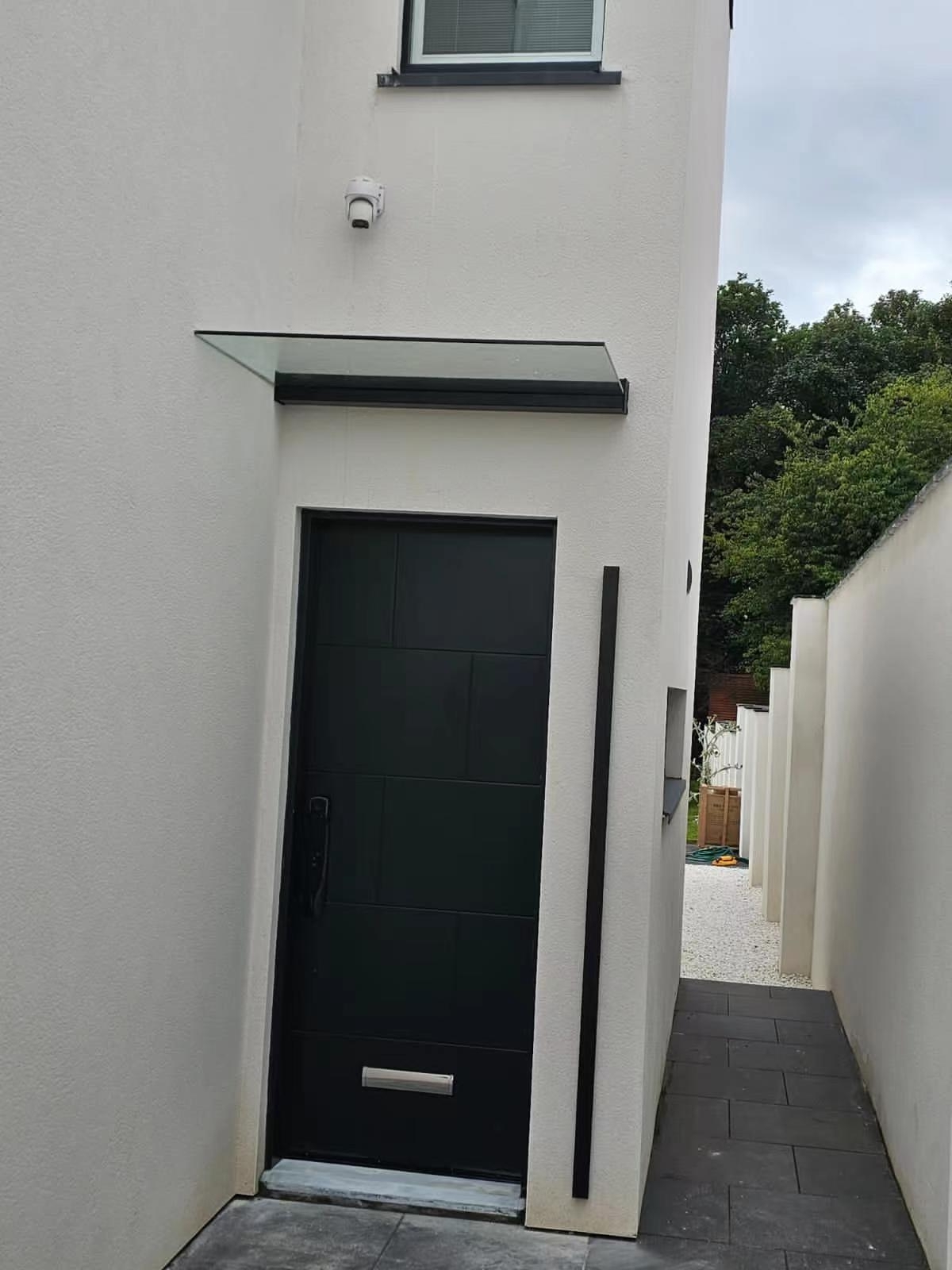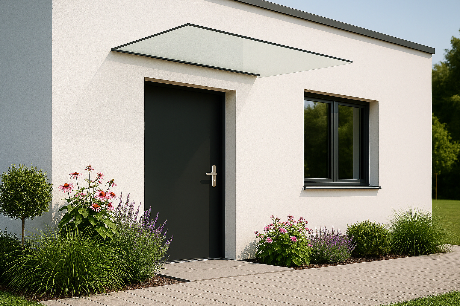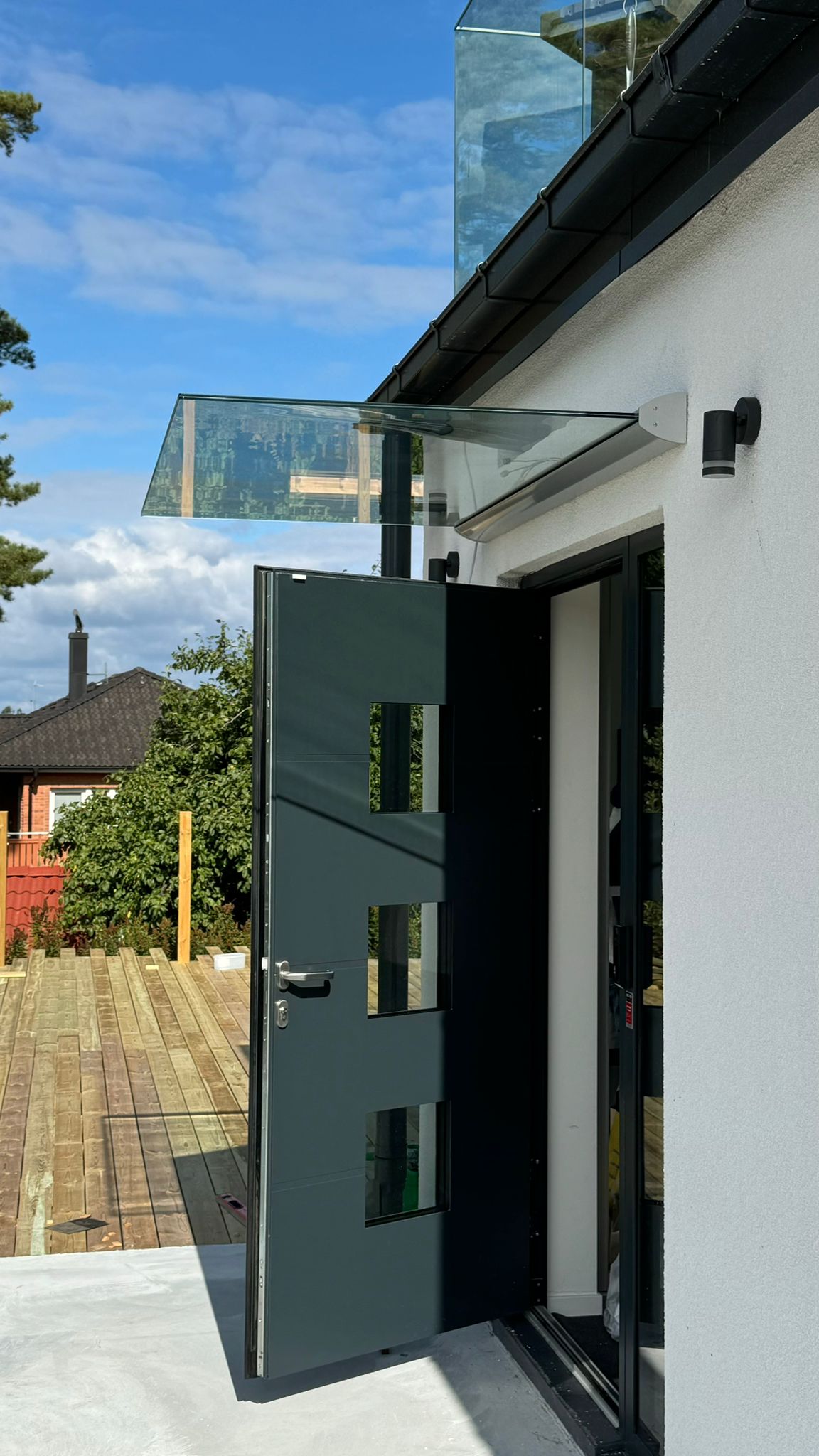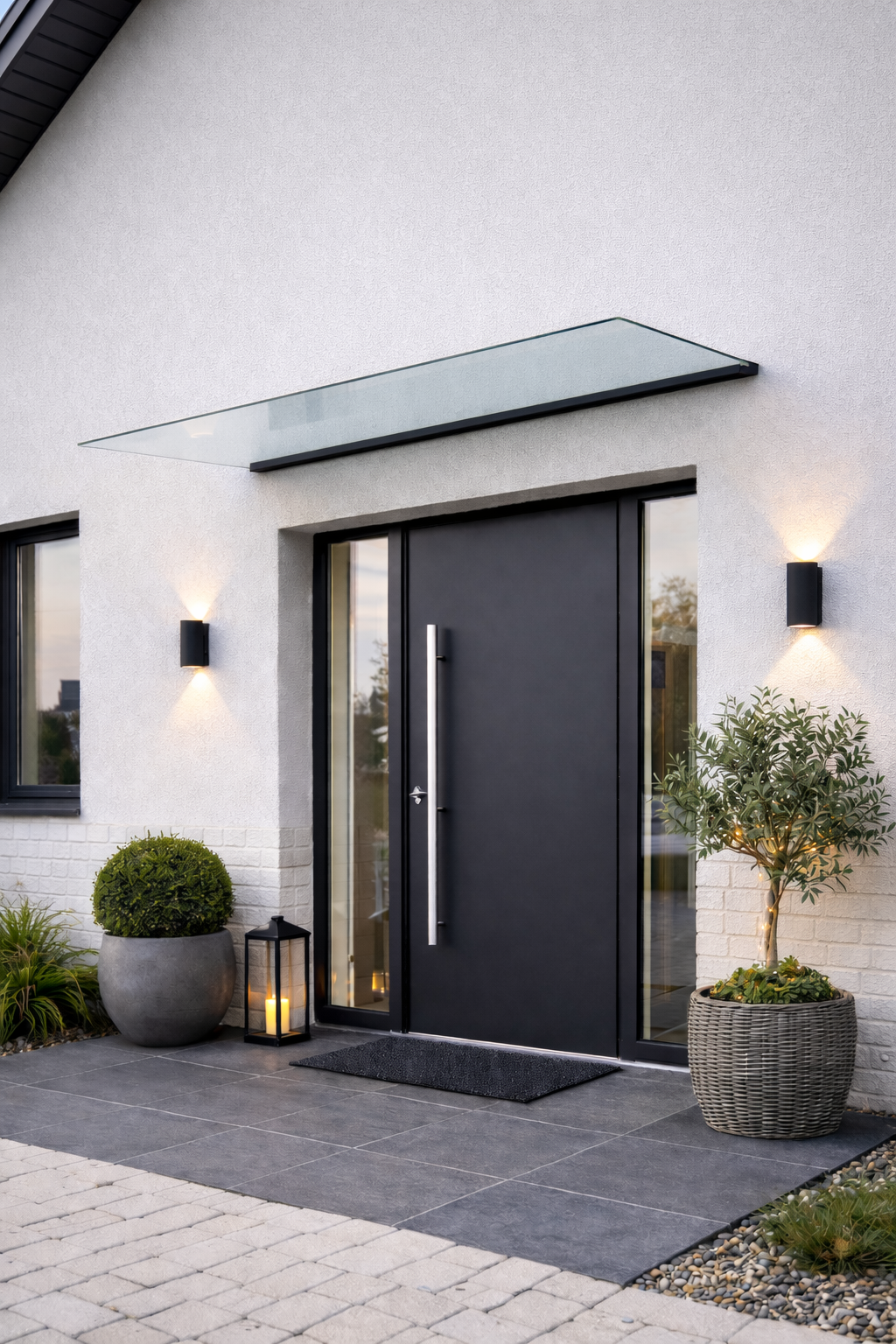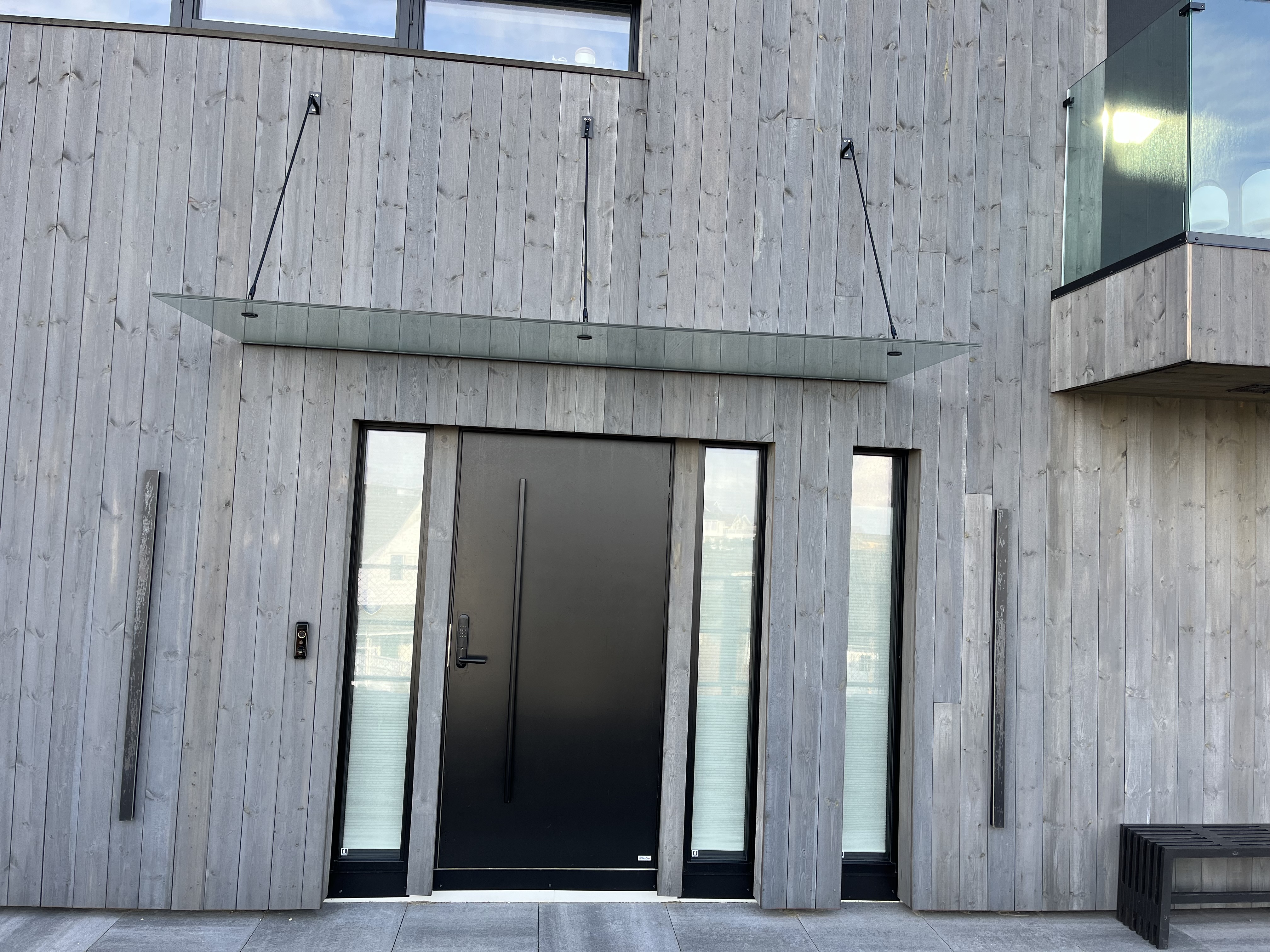 En baldakin i glass gir et gjennomført førsteinntrykk og gjør inngangspartiet både mer funksjonelt og mer visuelt tiltalende – år etter år, uten vedlikehold.
