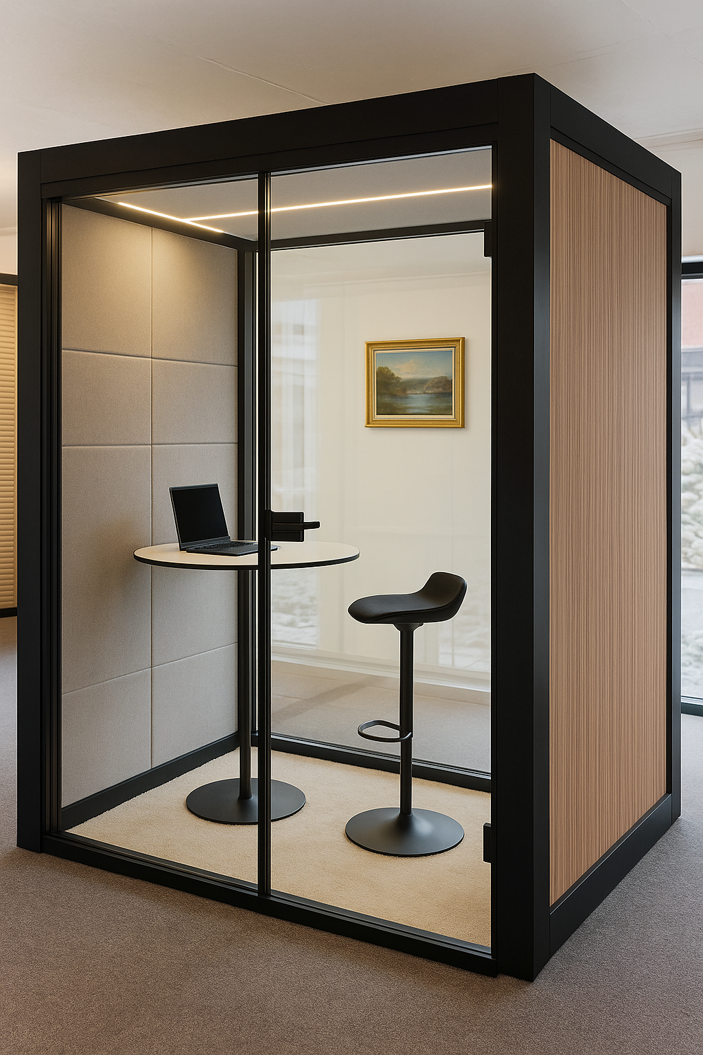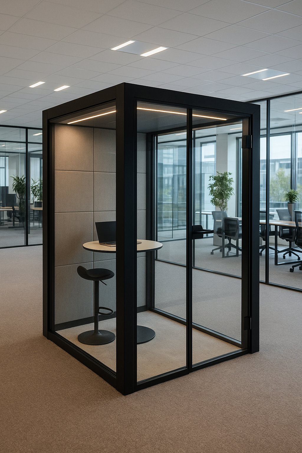Et moderne stillerom i glass og aluminium med lyd reduserende plater, integrert ventilasjon og belysning. Designet for åpne kontorlandskap og fleksible miljøer – gir ro, fokus og konfidensialitet i arbeidshverdagen.