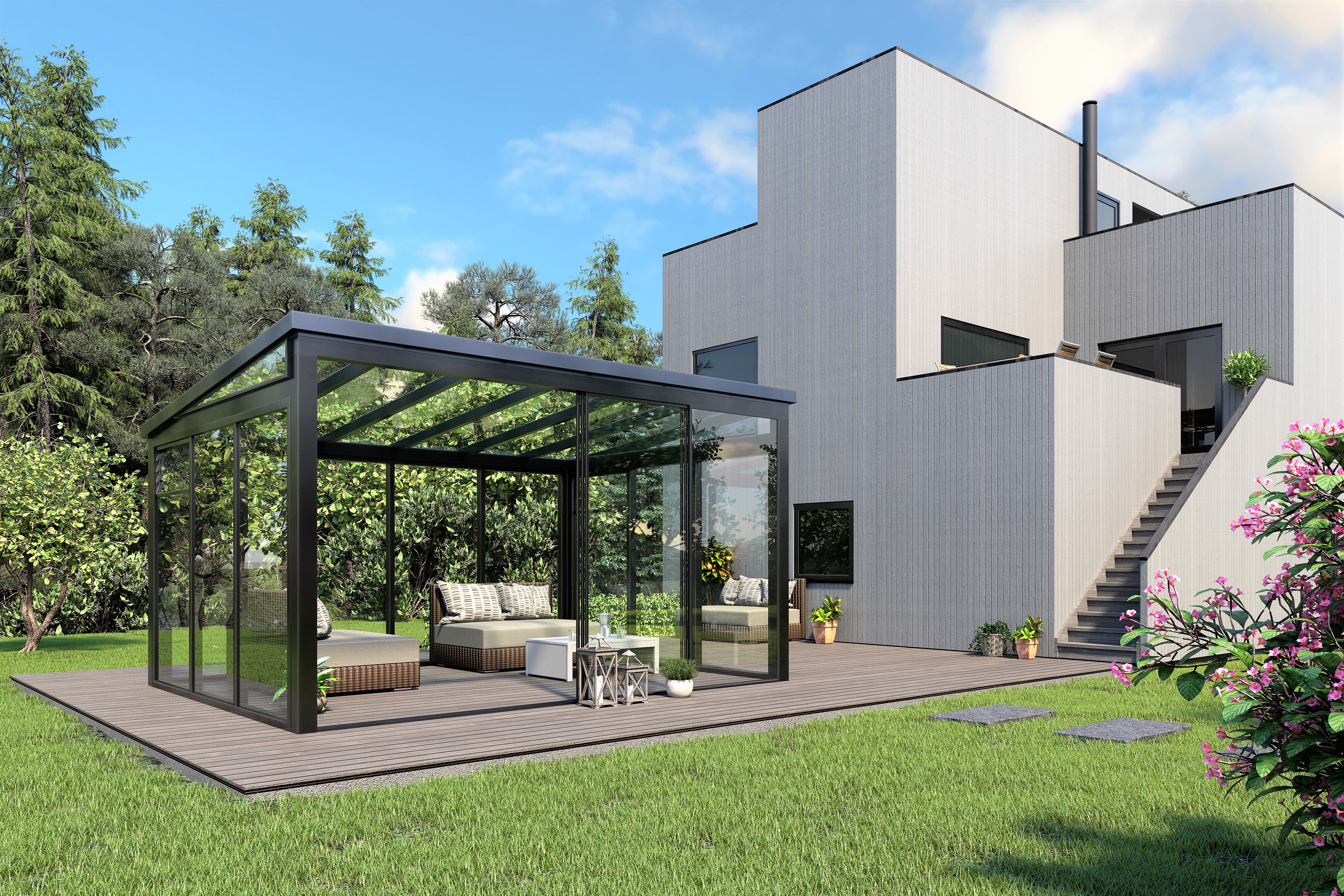 En frittstående hagestue gir et eget rom i hagen – et lunt og lyst oppholdsrom som kan brukes store deler av året. Leveres i flere glass- og profilsystemer tilpasset klima og behov.