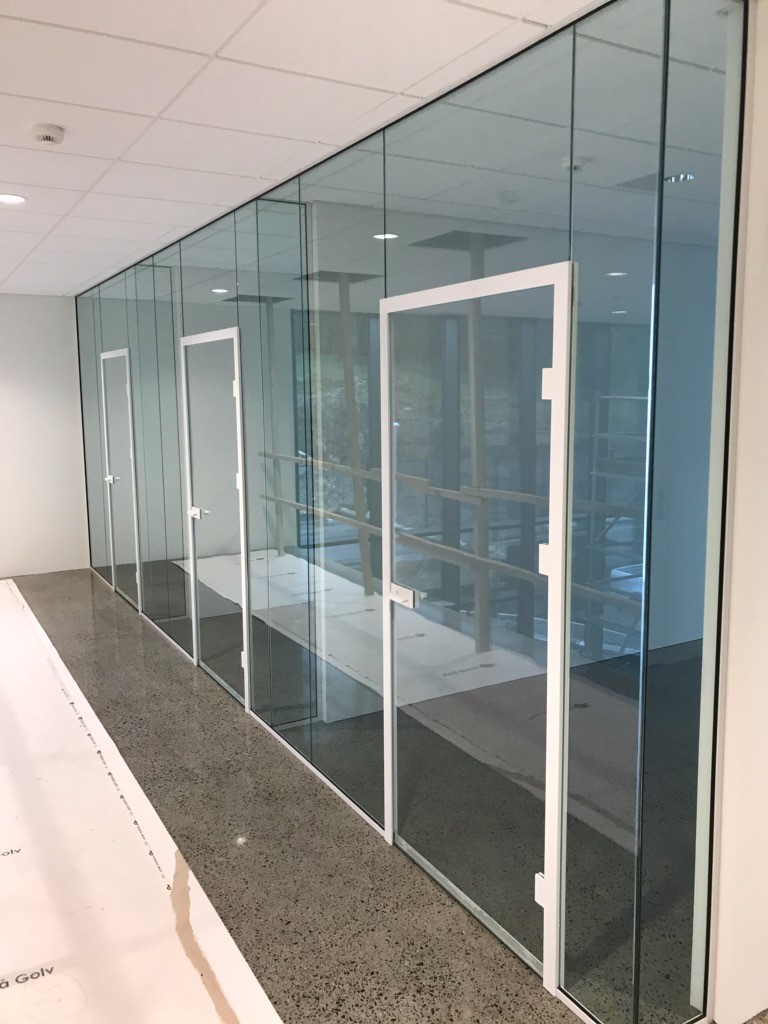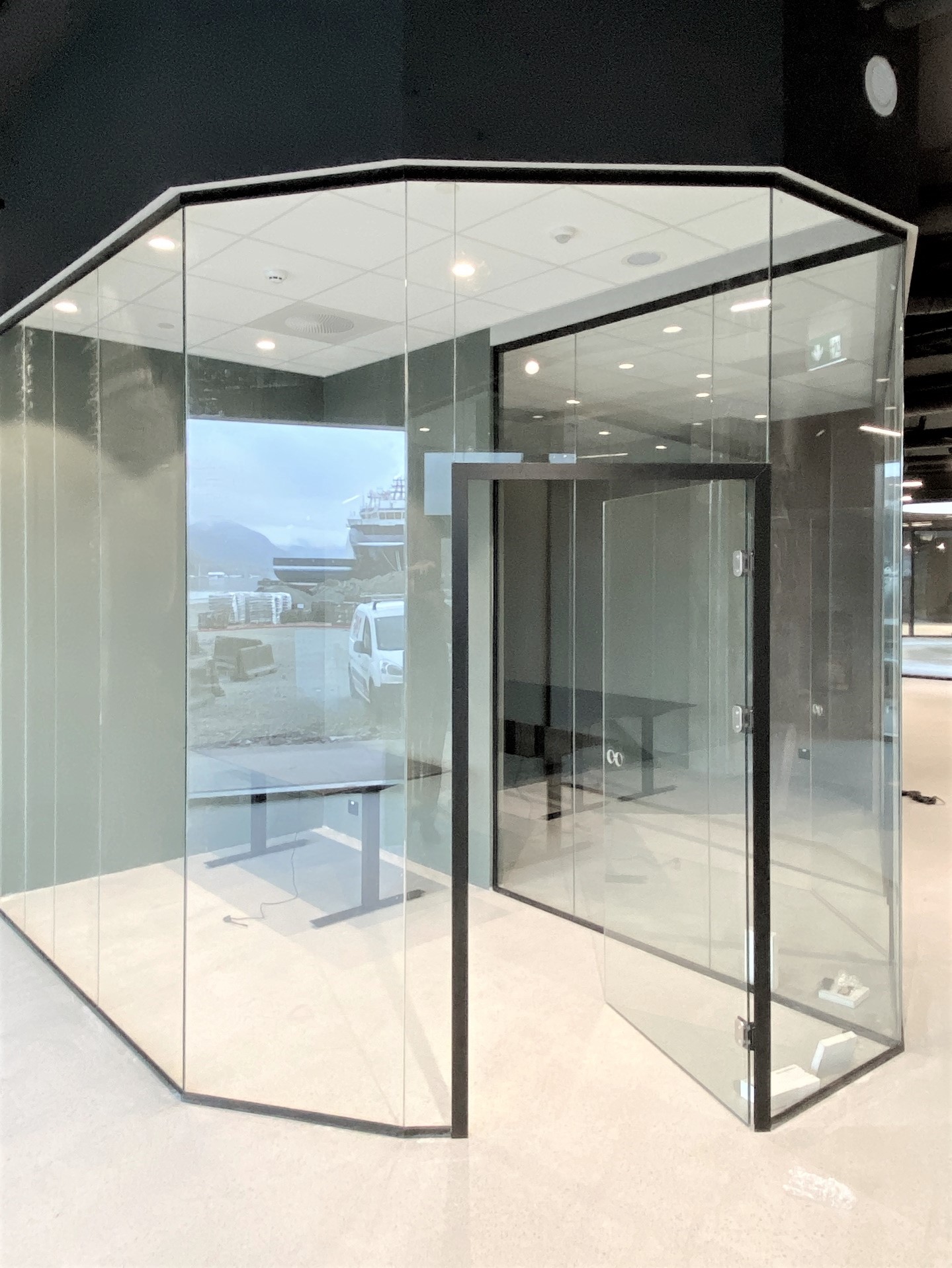 Helglassvegger gir et lyst og åpent miljø som skaper trivsel og energi i rommet. Perfekt for kontorer og møterom der naturlig lys er viktig.