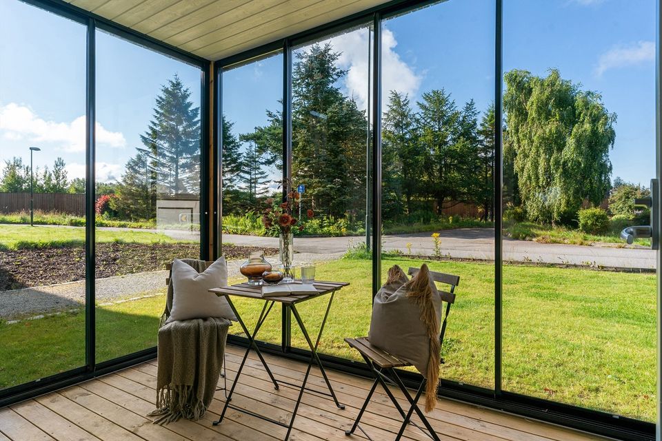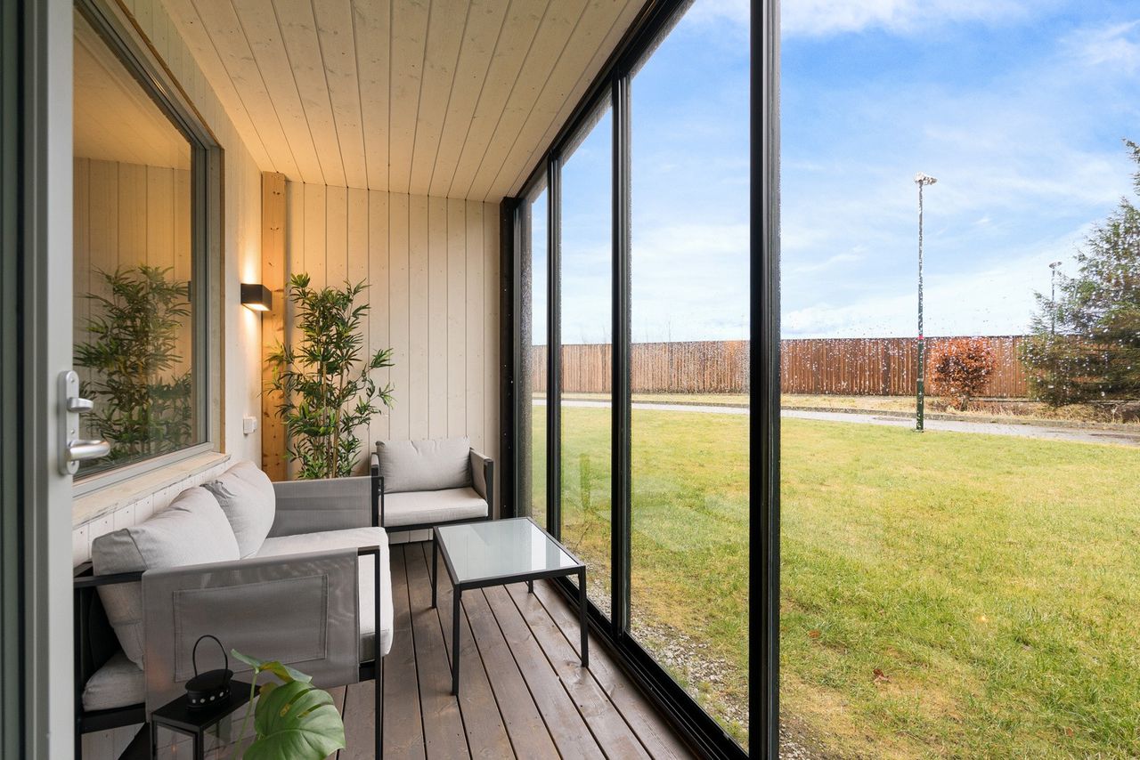 Store skyvedører i glass gir panoramautsikt og slipper inn naturlig lys, slik at du får en åpen og luftig følelse både inne og ute.