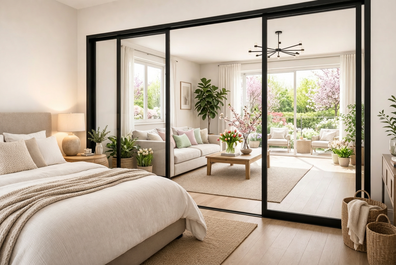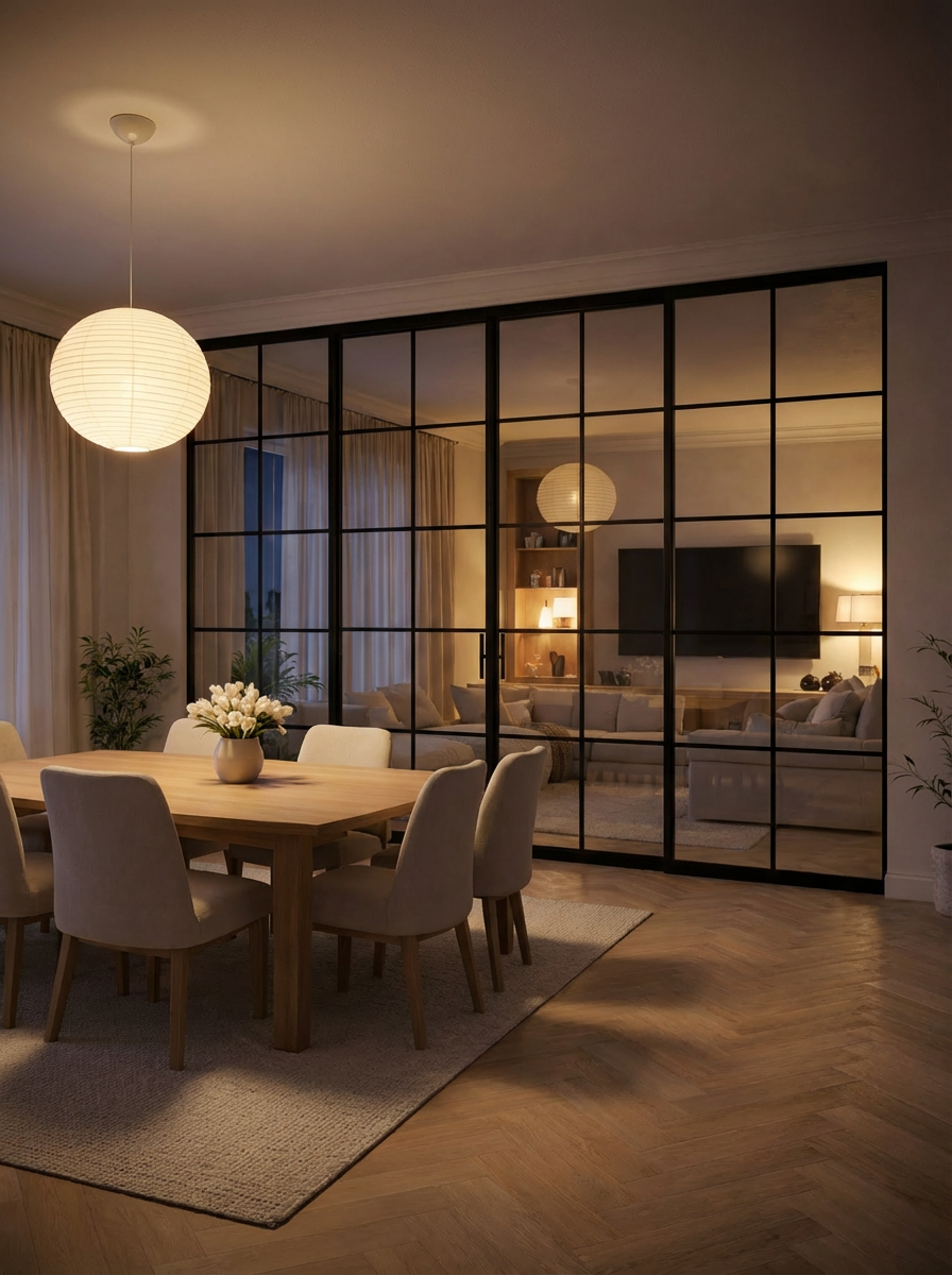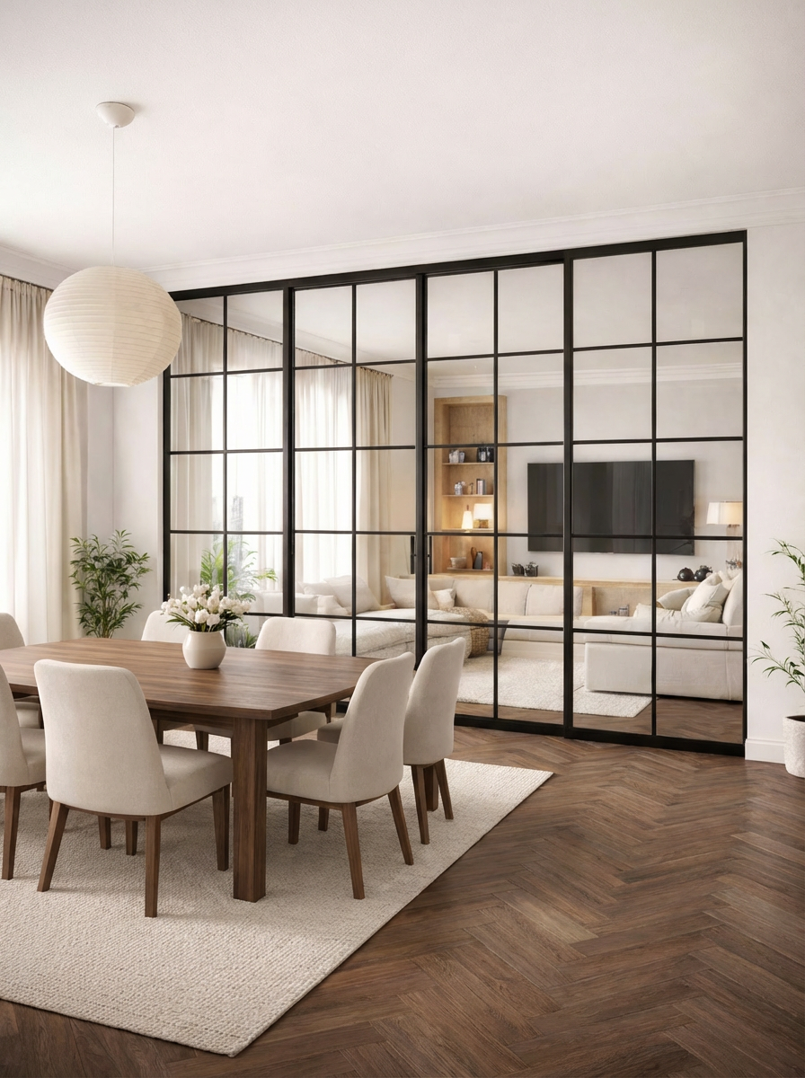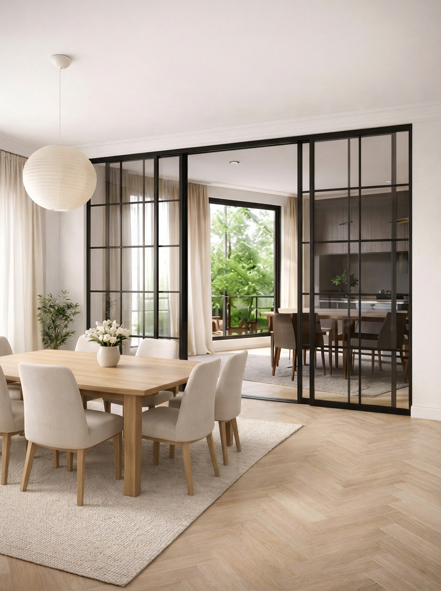 Skyvedører i glass gir fleksibel åpning og smart romdeling. En stilren og plassbesparende løsning for moderne hjem.