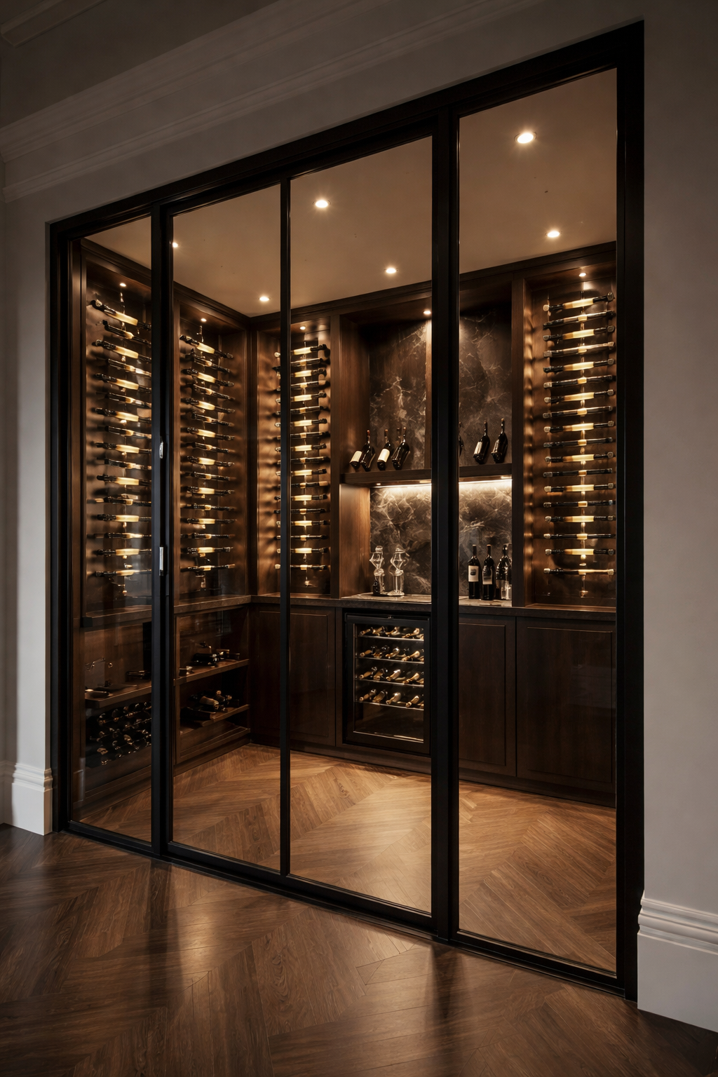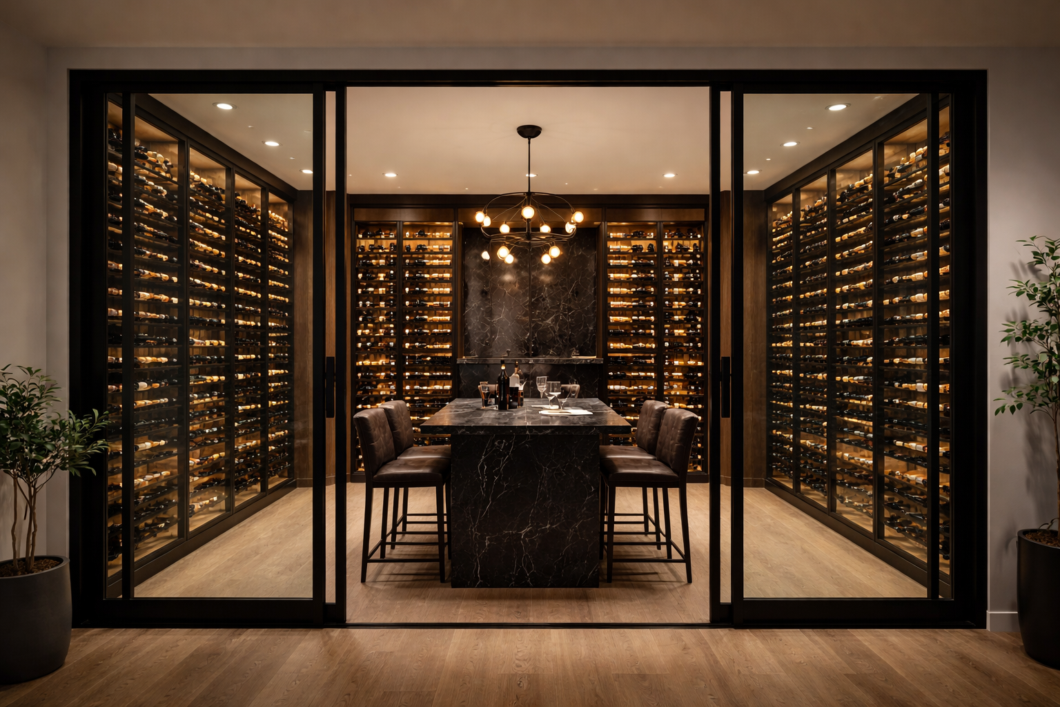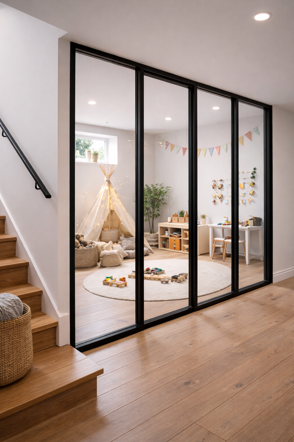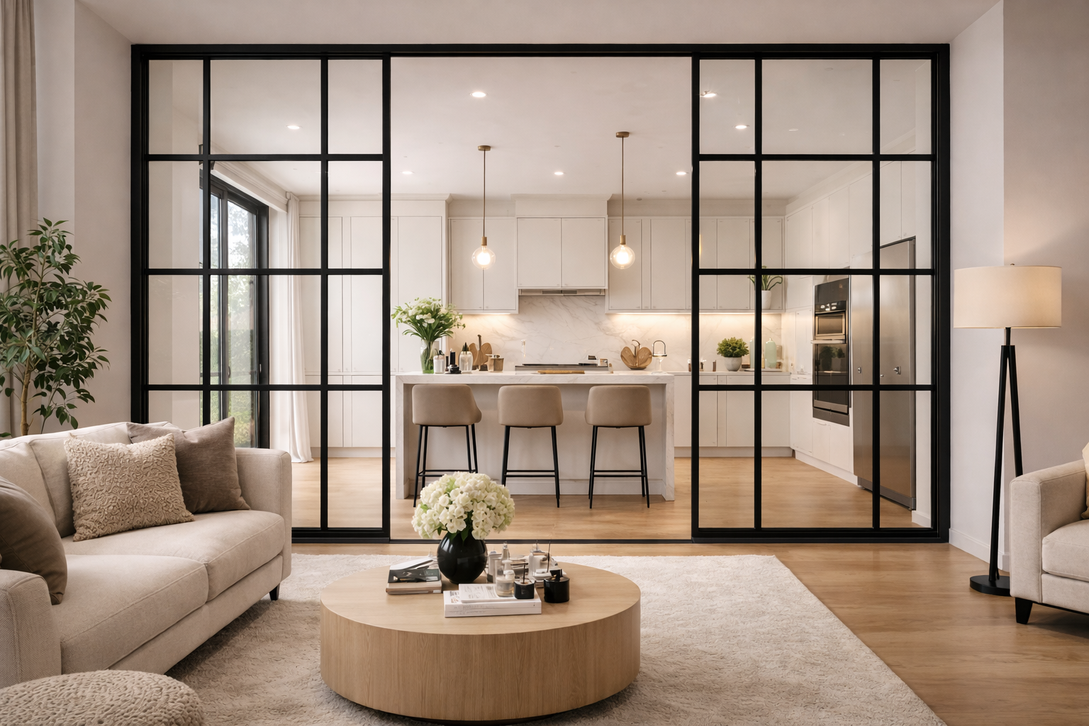 Skyvedører i glass gir fleksibel åpning og smart romdeling. En stilren og plassbesparende løsning for moderne hjem.