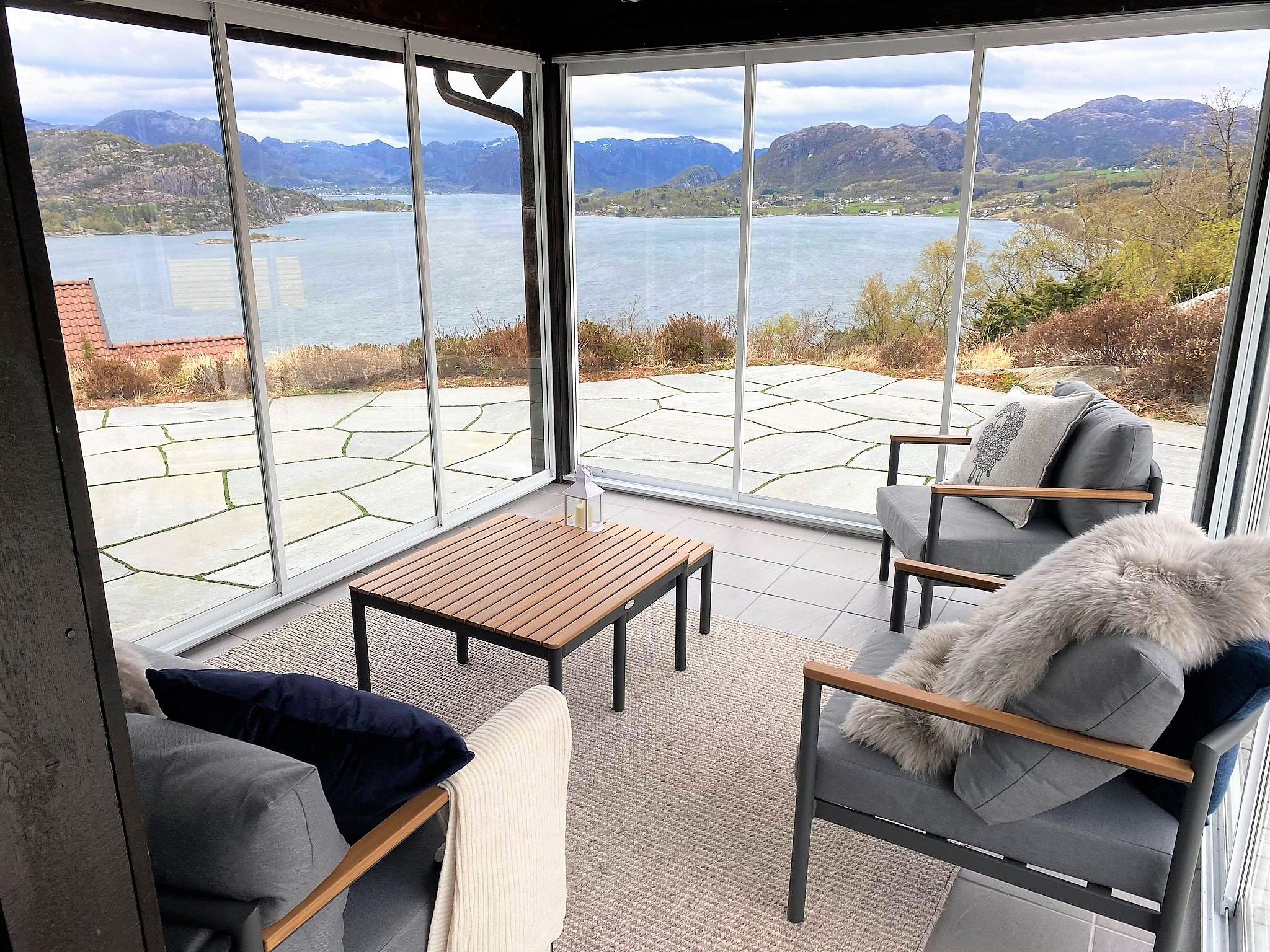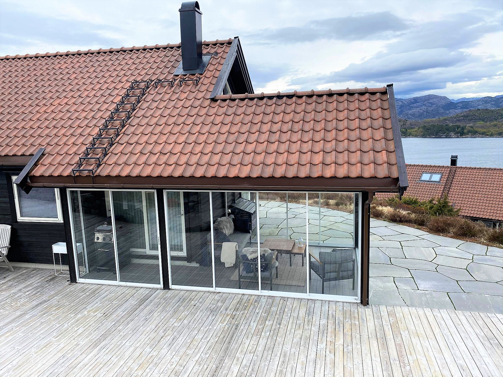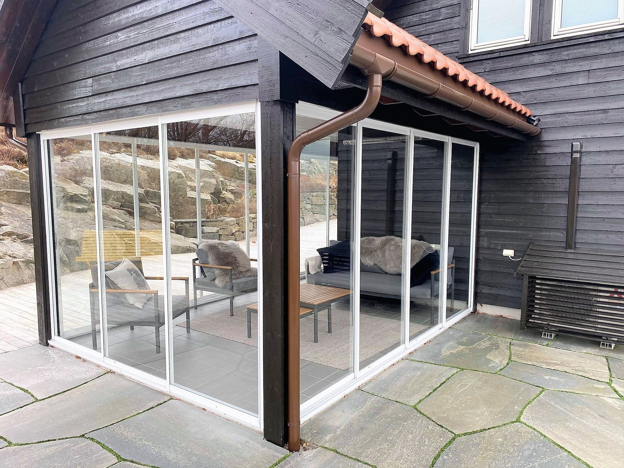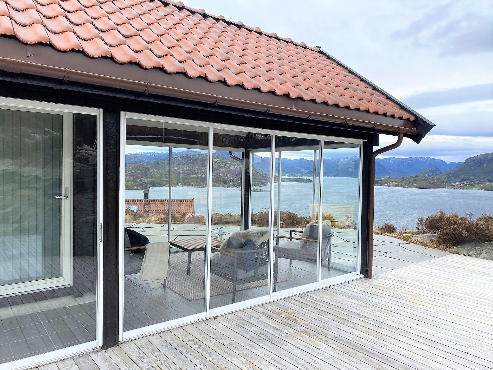 Skyvedørene leveres i vedlikeholdsfri aluminium og med store glassflater som gir godt lysinnslipp og uhindret utsikt. Samtidig skjermer de effektivt mot vind og vær, slik at uterommet kan brukes store deler av året.