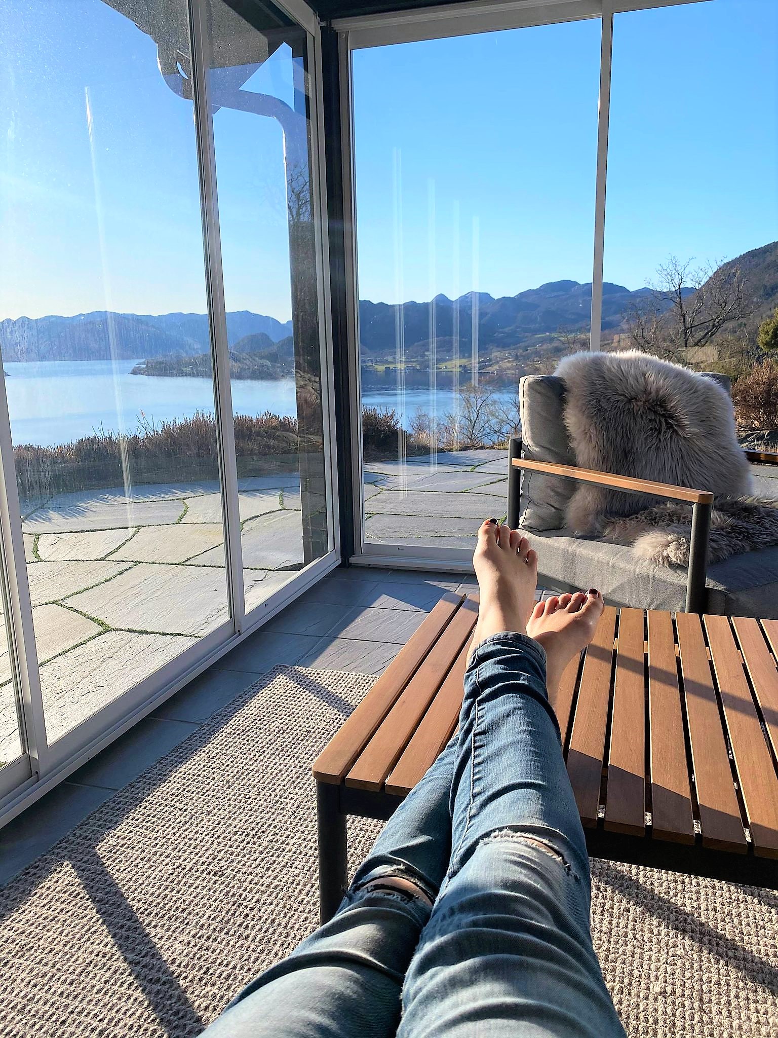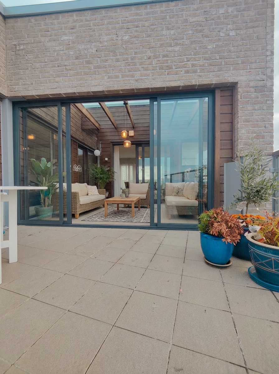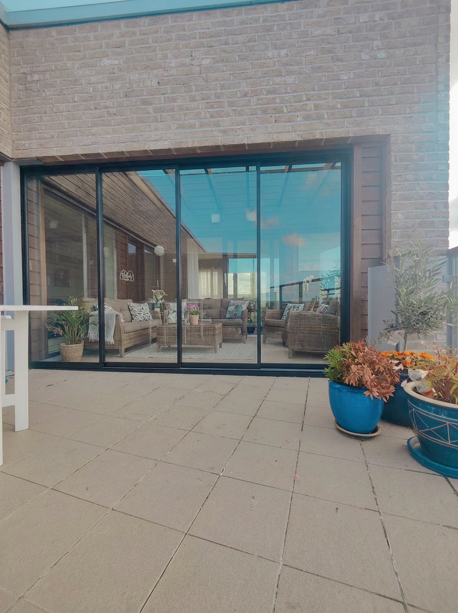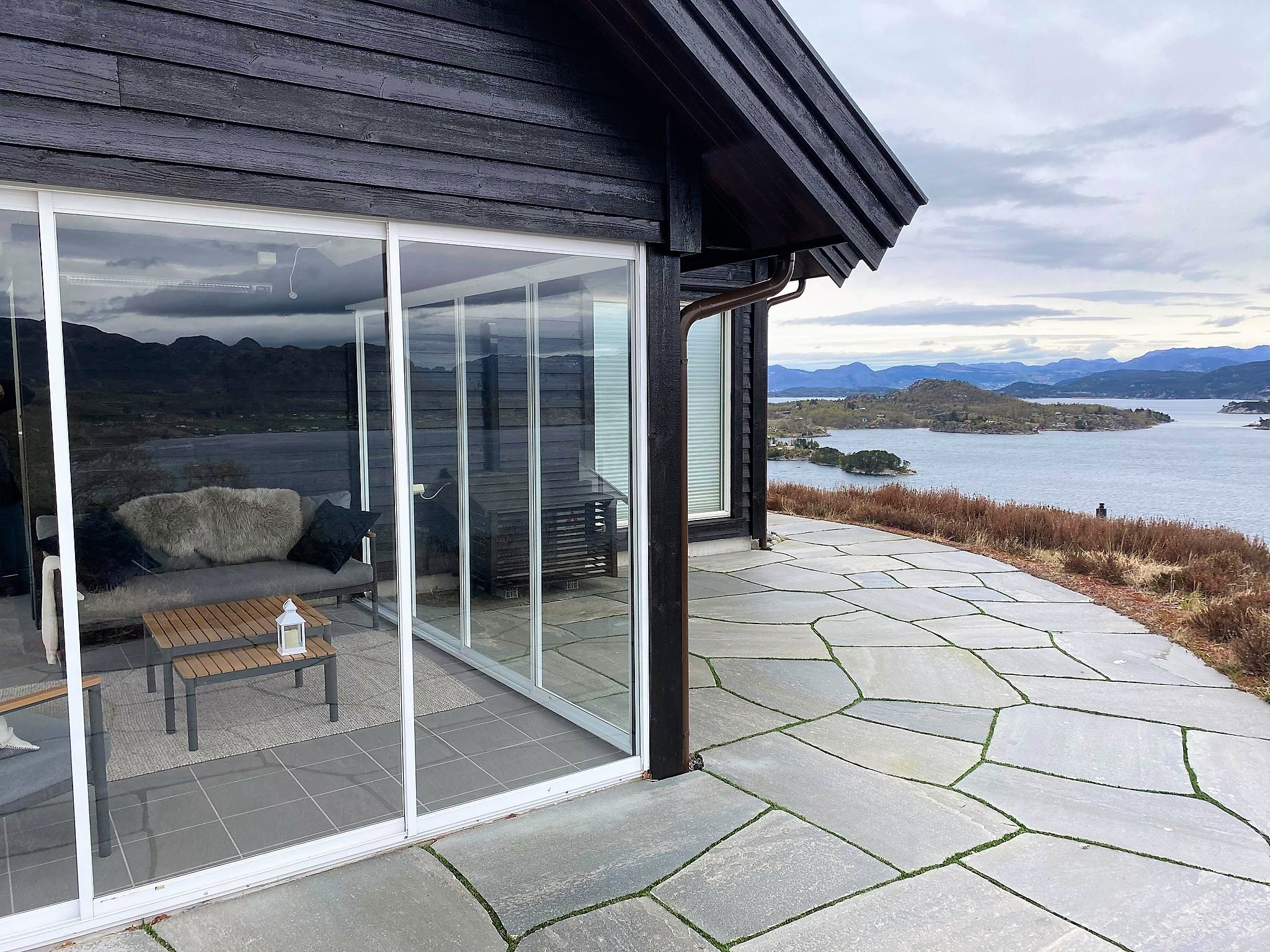 Skyvedørene leveres i vedlikeholdsfri aluminium og med store glassflater som gir godt lysinnslipp og uhindret utsikt. Samtidig skjermer de effektivt mot vind og vær, slik at uterommet kan brukes store deler av året.